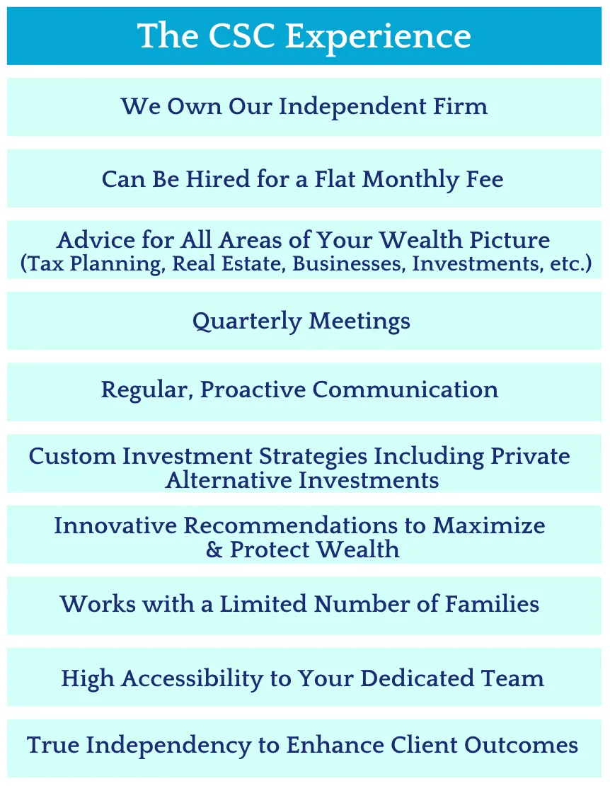 At CSC, we serve as your Family CFO—building a custom financial model that includes your taxes, real estate, business assets, and retirement goals.